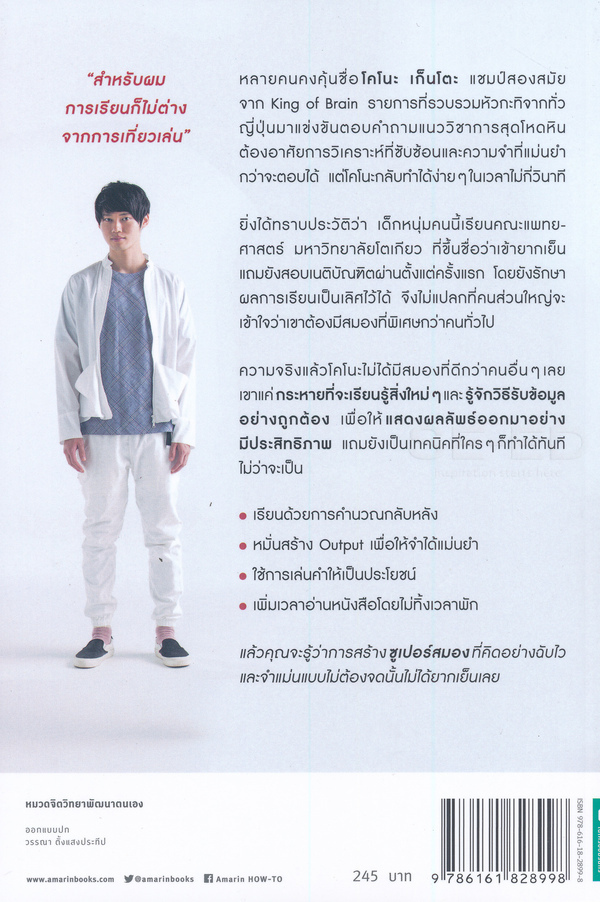 หนังสือ “โคโนะ เก็นโตะ ราชาสมองเพชร” เล่มนี้ ได้นำเสนอแนวทางการเรียนรู้ยุคใหม่ที่ไม่เน้นการจดบันทึก แต่เป็นการย่อยเนื้อหาให้สมองจดจำตั้งแต่ตอนที่ดูหรือฟังครั้งแรก ไม่ว่าจะเป็น เรียนด้วยการคำนวณกลับหลัง, หมั่นสร้าง Output เพื่อให้จำได้แม่นยำ, ใช้การเล่นคำให้เป็นประโยชน์, เพิ่มเวลาอ่านหนังสือโดยไม่ทิ้งเวลาพัก และอีกมากมาย แล้วคุณจะรู้ว่าการสร้างซูเปอร์สมองที่คิดอย่างฉับไว และจำแม่นแบบไม่ต้องจดนั้นไม่ได้ยากเย็นเลย