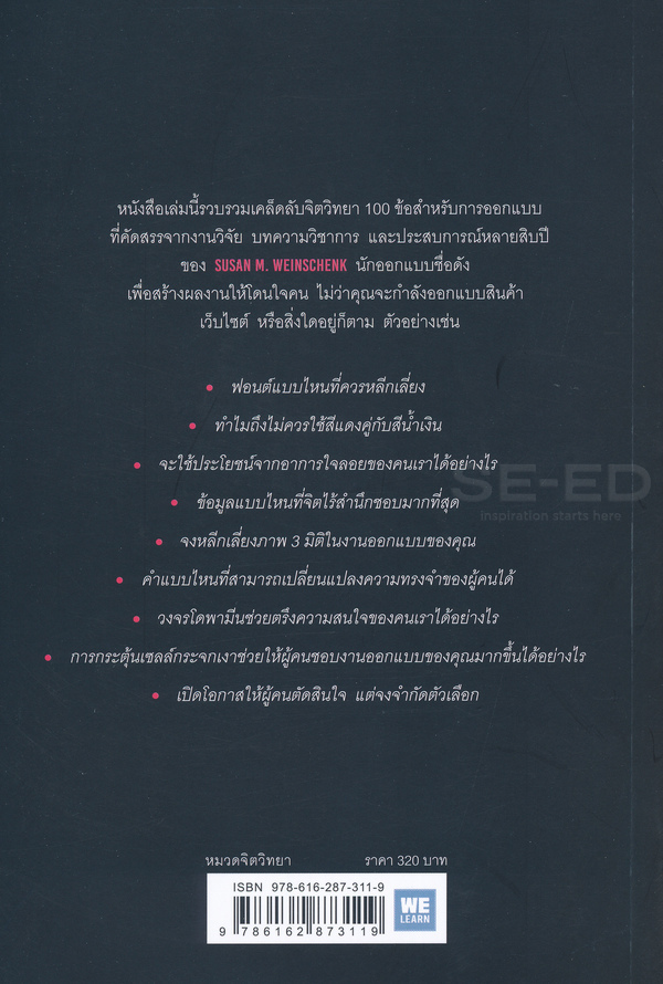หนังสือ “100 เคล็ดลับจิตวิทยาสําหรับคนที่อยากออกแบบให้เข้าถึงใจคน” เล่มนี้ รวบรวมเคล็ดลับจิตวิทยา 100 ข้อสำหรับการออกแบบที่คัดสรรจากงานวิจัย บทความวิชาการ และประสบการณ์หลายสิบปี ของ “Susan M. Weinschenk” นักออกแบบชื่อดัง เพื่อสร้างผลงานให้โดนใจคน ไม่ว่าคุณจะกำลังออกแบบสินค้า เว็บไซต์ อุปกรณ์ทางการแพทย์ หรือสิ่งใดอยู่ก็ตาม คนที่ได้รับประโยชน์จากงานออกแบบชิ้นนั้นก็คือผู้ใช้งาน และประสบการณ์ที่ผู้ใช้งานจะได้สัมผัสก็ขึ้นอยู่กับสิ่งที่คุณรู้และไม่รู้เกี่ยวกับพวกเขา พวกเขาคิดอย่างไร ตัดสินใจอย่างไร สิ่งใดที่กระตุ้นให้พวกเขาคลิกซื้อ หรือทำในสิ่งที่คุณต้องการ คุณกำลังจะได้เรียนรู้เรื่องทั้งหมดเหล่านั้นจากหนังสือเล่มนี้