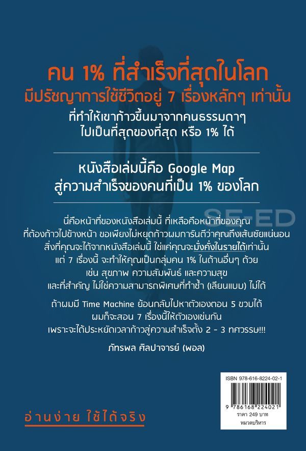 คุณเคยสงสัยหรือไม่ว่า ทำไมคนเราจึงต่างกัน? จากสถิติแล้ว มีคนไทยเพียง 1% คนเท่านั้น ที่เกษียณได้อย่างมั่งคั่ง, มีบัญชีเงินฝากไทยเพียง 1% เท่านั้นที่มี 10 ล้านบาทขึ้นไป, โลกนี้มี 195 ประเทศ แต่มีเพียง 2 ประเทศที่มี GDP สูงสุดและคุมแทบทั้งโลก คือ สหรัฐอเมริกาและจีน นั่นเท่ากับ 1% เช่นกัน อะไรส่งผลให้ 1% นั้นต่างกันราวฟ้ากับเหว หนังสือ “The One% สิ่งที่คนสำเร็จ 1% ของโลกทำ คน 99% อยากรู้” จะเฉลย 7 กฎแห่งความสำเร็จ ที่คน 1% ของโลกทำ สิ่งที่คุณจะได้จากหนังสือเล่มนี้ ไม่ใช่แค่ความมั่งคั่งทางรายได้เท่านั้น แต่กฎ 7 ข้อนี้ จะทำให้คุณเป็นกลุ่มคน 1% ในด้านอื่นๆ ด้วย เช่น สุขภาพ ความสัมพันธ์ และความสุข และถ้าพวกเราอีก 99% ได้ลองค่อยๆ ทำความเข้าใจและลงมือทำ ไม่ว่าใครก็ประสบความสำเร็จในแบบฉบับของตัวเองได้ไม่ต่างกัน